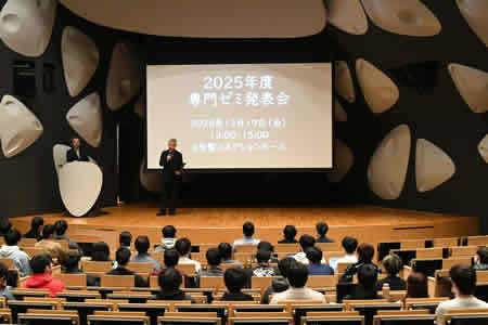 冒頭では、中野学長による開会のあいさつが行われました。会場は発表会の始まりにふさわしい引き締まった空気に包まれ、これまで専門ゼミで取り組んできた学びの成果を発表する場として、会がスタートしました。