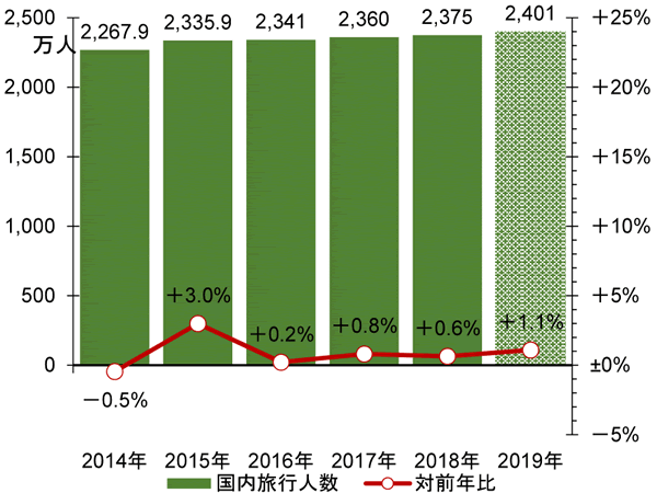 このJTBの調査に拠れば、2019年G.W.の国内旅行人数、海外旅行人数とも過去最高を記録した(旅行人数は延べ人数)。国内旅行人数は2,401万人(対前年比1.1%増)、海外旅行人数は66.2万人(同6.9%増)となった。2014年から直近6年間のG.W.国内旅行人数の推移を図1に示す。