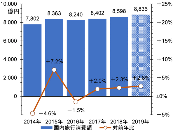 一方の国内旅行消費額(図2)は対前年比2.8%増の8,836億円を記録し、伸び率だけを比較すると国内旅行人数の伸び率よりも大きな伸び率となった。この調査結果から国内旅行では一人あたり旅行消費額が増えていることが読み取れる。このJTBの調査でも国内旅行平均費用(交通費・宿泊費・土産代・食費等)が36,800円、対前年比で1.7%増という結果も示されている。