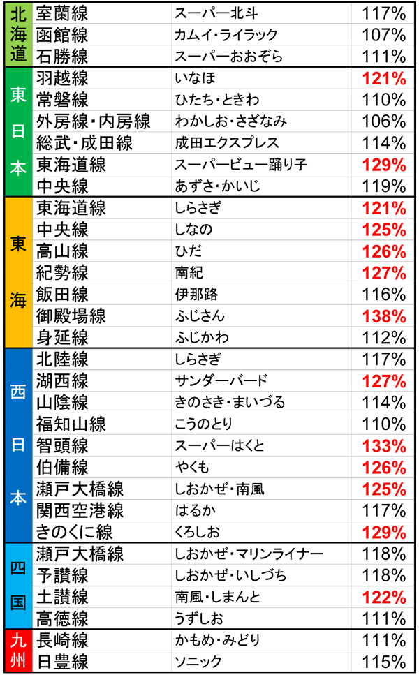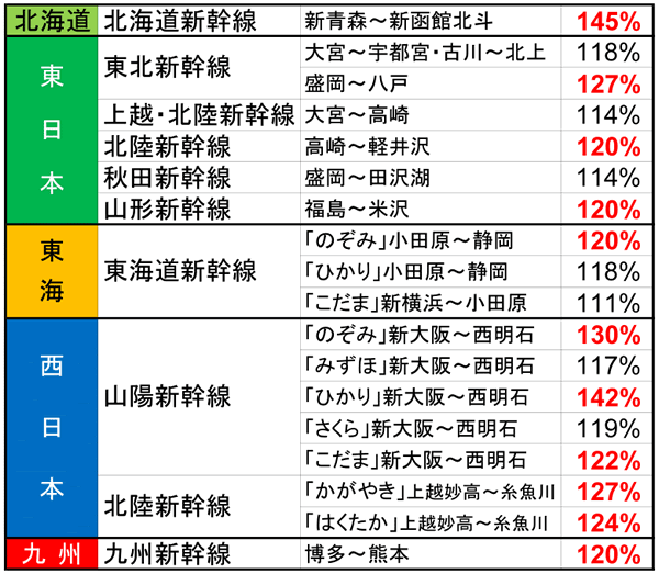 まずは、新幹線である(表1)。各新幹線とも軒並み対前年比110%以上を記録し、北海道新幹線では1.5倍に届くほどの伸びを示した。また、もともと16輛編成で輸送力が大きく、運行本数も多い山陽新幹線「のぞみ」で130%を記録するなど、各新幹線とも対前年比で利用者数を大きく伸ばした。