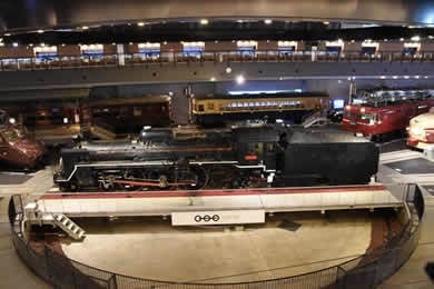 退館前に、車両ステーション1F中央で記念写真を撮りました。中央の転車台には、地方路線の旅客列車牽引に活躍した「貴婦人・C57形蒸気機関車」の135号機が展示されています。