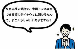 その後は、岡山支社内(兵庫から広島)だけでなく、もっと全国のダイヤづくりをしたい(始発から終着まで)と言っていたところ、東京本社勤務になりました。東京本社では青函トンネルができるときに、そのダイヤづくりを考えることに。国交省や関係旅客鉄道の担当者との打ち合わせも多く大変苦労しましたが、やりがいのある楽しい仕事だったとの事でした。