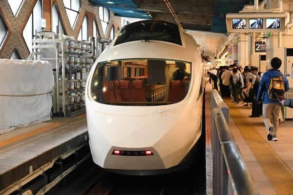 小田急のVSE(50000形)です! 昨年3月11日に定期運行を終了した、白いボディーのロマンスカーです! 今年12月には完全に引退する予定で、多くの人にとってもはやひと目見ることすら叶わない車両。それに乗車できるというのですから、多くの学生にとって貴重な機会となること間違いなしでした。