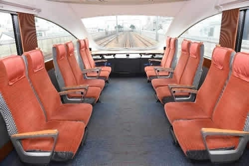 展望席です! 普段は全面の窓に向かって席が配置されていますが、このように向かい合うように配置することも可能とのこと。私も初めて見ました。