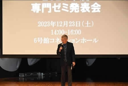 12月23日(土)に専門ゼミ発表会が開催されました。本学では、2年生は全員、専門ゼミに所属し、1年かけて卒業論文の執筆をします。今回は6つのゼミから8名の代表者が発表をしてくれました。大人数の前で発表する機会はあまりないので、かなり緊張をしている学生もいましたが、みなさん堂々としたよい発表でした。