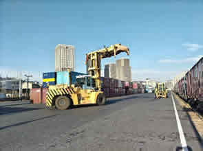 到着直後から始まる機関車の入換作業、コンテナの取卸し作業。トップリフターはなかなかの迫力です。