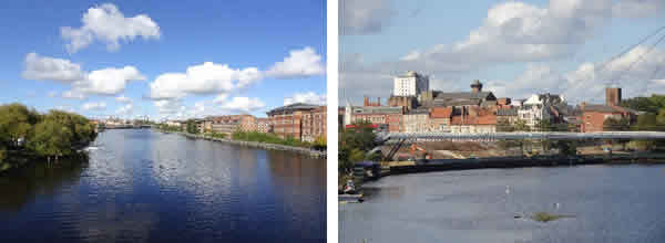 これが現在のティーズ川。そしてもともとのストックトン駅は、右の写真奥の建物の付近にあったらしい…