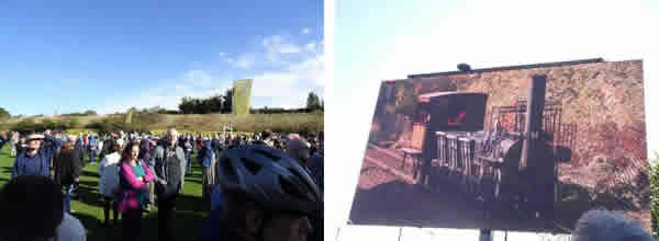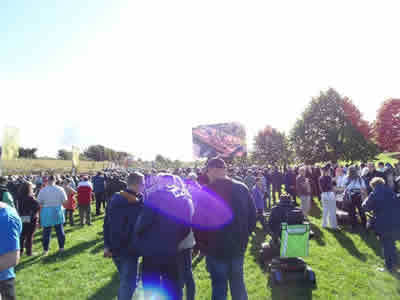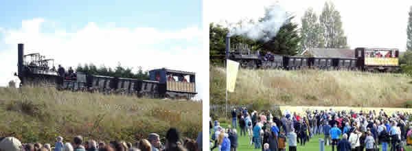 左写真の奥の築堤に、ロコモーション号がお出ましになります。会場には巨大スクリーンも。ロコモーション号の様子が映し出されています。