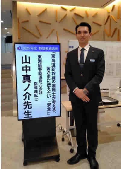 11月15日(土)の特別教養講座(https://toko.hosho.ac.jp/special_lecture.html)で、本学卒業生(現在、東海道新幹線 指導運転士)の山中真ノ介先生にご講演いただきました。