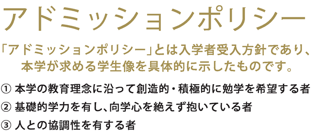②出願基準:高等学校在学中の成績(おおむねとして、学習成績の状況3.0以上)・人物・健康などにおいて優れた者。