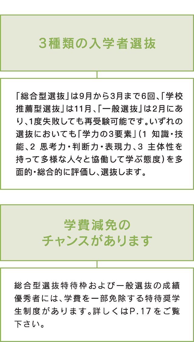 ※特待生選抜枠での合格者全員が特待生となるわけではありません。入学後にさらに選考を行います。