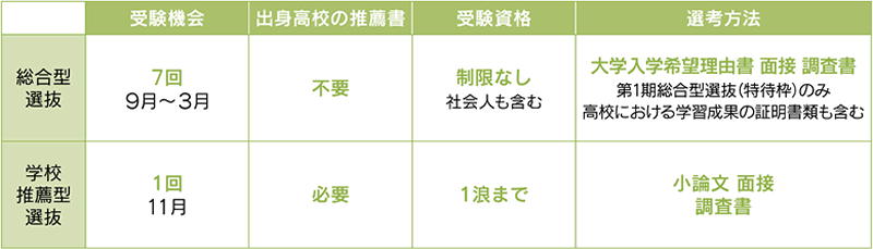 総合型選抜は推薦書が要らず、高校生に限らず大学生や社会人でも受験が可能ですので、早い段階で受験の意志が固まった人に向いています。期によっては、専願制か併願制か異なります。学校推薦型選抜との違いを以下の表でよく確認してください。
