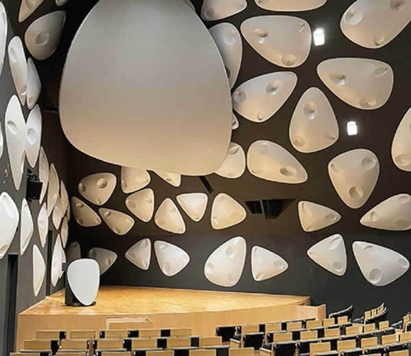 エントランスホールの壁に網目状に配置された木材は、ドロネー図というロシアの数学者ボリス・ドロネーによって考案された幾何学模様である。任意に配置された点同士を最短で結ぶことで形成される図形で、交通等の研究分野でも用いられることがある。(90周年冊子より抜粋)