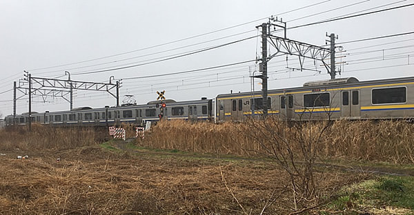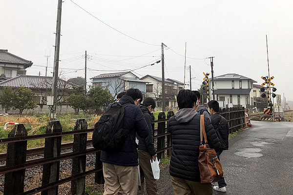 いったん方針が決まれば動きが早いのが鉄研の良いところ。部員たちは、出かけやすく楽しく写真が撮れそうな田園地帯を調べました。そして、千葉県の木更津駅周辺に行くことが決まりました。当日はあいにくの曇り空でしたが、立ち食いそばを食べたり線路を見ながら歩いたりするうちに、心身ともに暖かくなってきました!農道、用水路、小規模な踏切などをゆっくりと見ることができました(もちろん私有地には入りません)。ある地点で舗装と未舗装が分かれている不思議な道路もありました。これは、車内からの観察では分からないことでしたので、現場に足を運んだかいがありました!