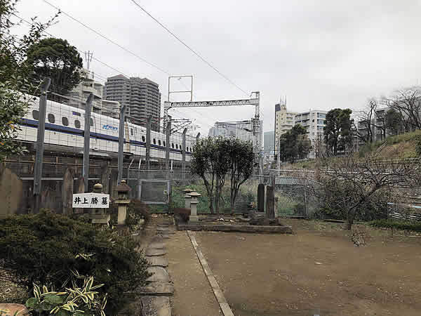 次に、2020年に入ってから、「日本の鉄道の父」と呼ばれる官僚・実業家の井上勝(1843-1910)の墓所に行きました。山口県(当時の長州藩)出身の井上は、二十歳の時に、後に初代総理大臣になる伊藤博文らとともにイギリスに密航しました! イギリスでは、ロンドン大学で工学を学びました。帰国後には1871年に28歳で初代鉄道頭に就任し、それ以降は、鉄道庁長官など鉄道行政の第一人者として日本の鉄道を育てた人です。そんな井上の墓所は、京急線新馬場駅からほど近い、東海寺大山墓地です。