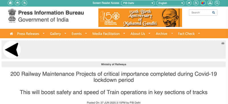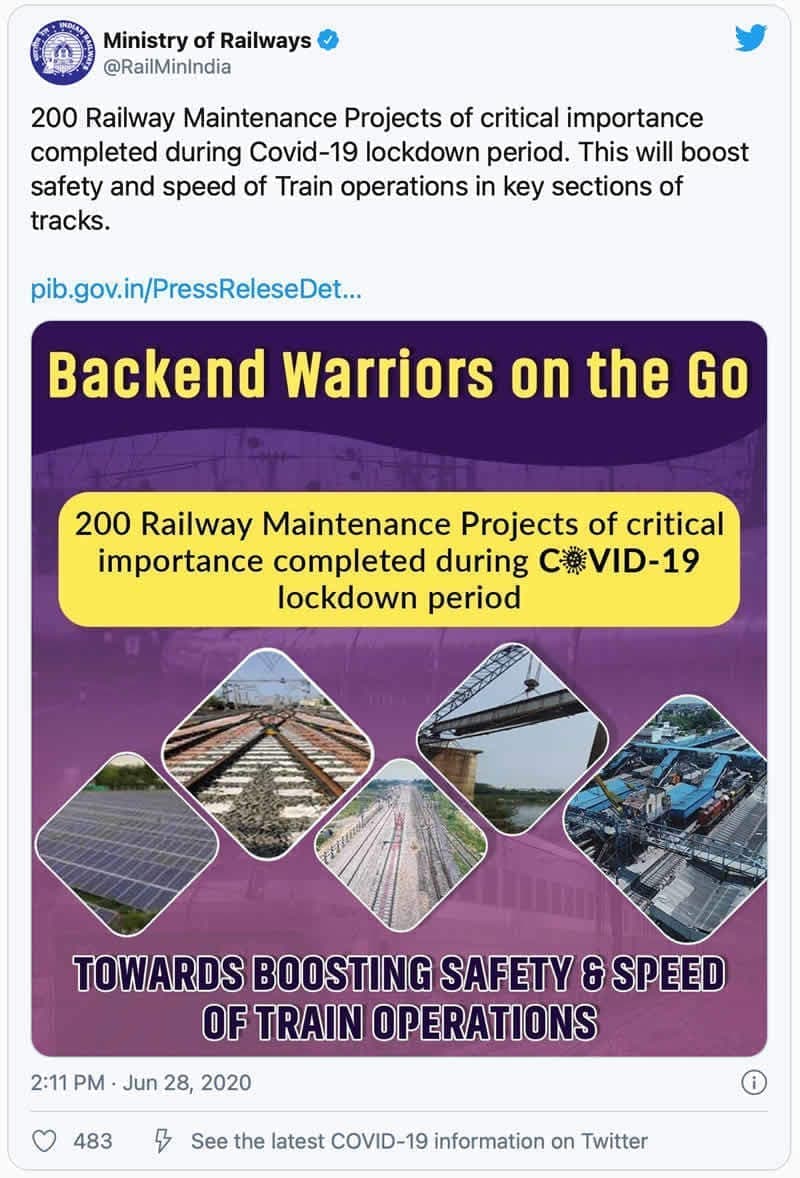 「COVID-19によるロックダウン期間中に、極めて重要な200件の鉄道メンテナンスプロジェクトを完了」(出典:https://twitter.com/RailMinIndia/status/1277107368703094784 2021.1.6閲覧)