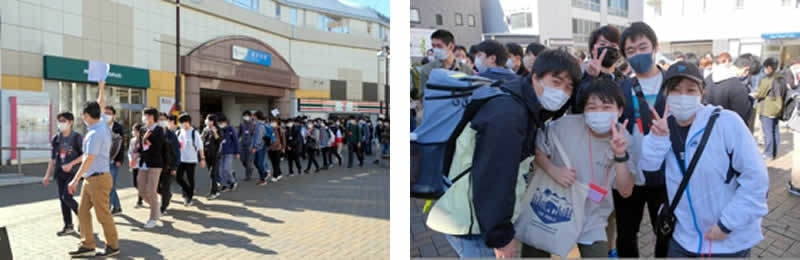 晴天に恵まれ、学生たちが集合しているのは・・・小田急線の喜多見駅!