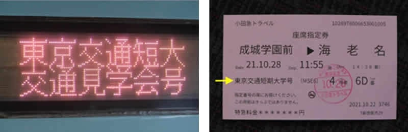 しかも見てください、ロマンスカー前面の行先表示器と、座席指定券には本学の名前が!!