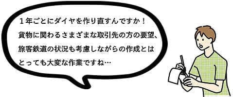 ダイヤづくりは、お客様の要望を営業担当者から聞き、いつ集荷を終え駅に来るのか、それをどのホームで載せるのか、機関車、貨車、運転士など準備は出来るのかなど、そして、お客さまの希望の時間帯、場所を踏まえて、各旅客会社の施策状況も把握し作っていく必要があります。