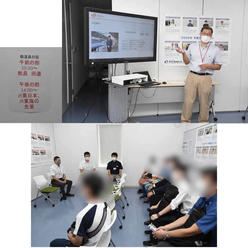 本学のOBで現在鉄道会社でご活躍されている方に多くお越しいただきさまざまなテーマでお話をしていただきました。