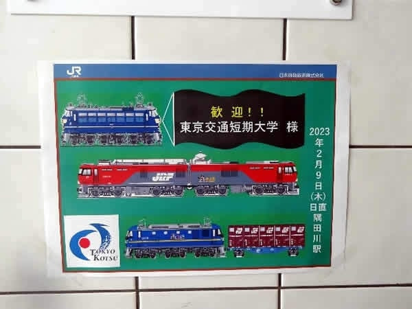駅の入り口では素敵な歓迎の案内板が掲げられていました!「歓迎!! 東京交通短期大学 様」の旗を牽引するEF66が27号機なのは、さすがJR貨物様、芸が細かいですね!国鉄時代の電気機関車好きにとってはとても嬉しい歓迎です(笑)。