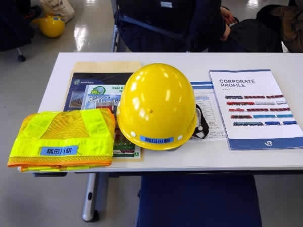 その後、ヘルメットと反射ベストをつけて見学開始です。歴史ある「隅田川駅」の表示が嬉しいですね。私は初めて反射ベストをつけるので、つけ方が分からず社員の方に手伝ってもらいました。お手数をおかけしてしまってすみません(汗)。どこかで経験を積んでおけば良かったです。