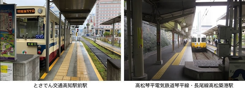 路⾯電⾞では、今も多くの地⽅・駅で現役ですね! 「⾼知駅前」駅は、「汽⾞」(=JR)の⾼知駅の前にあります。地⾯から少しのスロープでホームに⾏けるので、⾜腰を痛めた⼈にも優しい形式です。