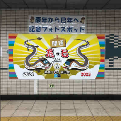 まず思いつくのは、「辰」と「巳」だけでできた駅名の、有楽町線「辰巳駅」ですね! なんと写真撮影用のコーナーが準備されています。きっと年末年始は混みあうのでしょうね〜。