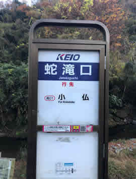 最後は、「蛇滝口」バス停です。高尾駅から小仏を目指す京王バス高01系統で6つ目です。「じゃたきぐち」と読みます。ここは、高尾山の「蛇滝」に登るための場所のようで、道しるべがあります。ここにはかつて蛇滝信仰があったようです。