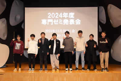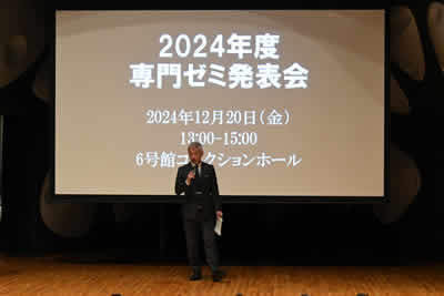 12月22日(金)に専門ゼミ発表会が開催されました。本学では、2年生は全員、専門ゼミに所属し、1年かけて卒業論文の執筆をします。今回は6つのゼミから9名の代表者が選ばれました。残念ながら1名の方は体調不良の為、参加できず指導教員が代わりに発表をしました。大人数の前で発表する機会はあまりないので、かなり緊張をしている学生もいましたが、みなさん堂々としたよい発表でした。