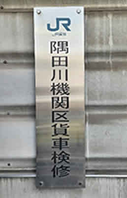 「隅田川機関区貨車検修」の看板。「検修」とはあまりなじみのない言葉ですが、「検査修繕」を意味するそうです。