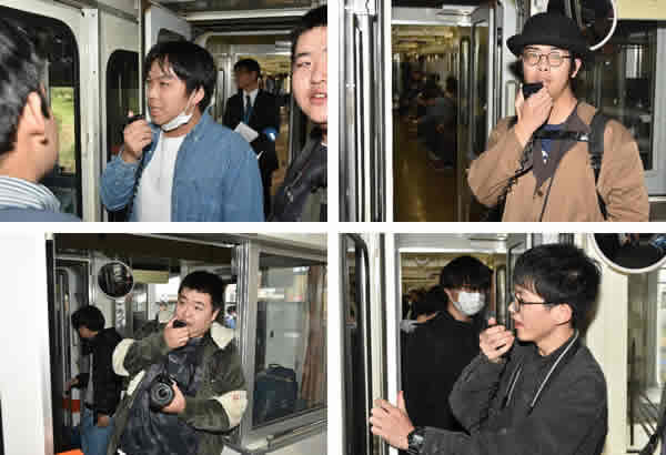 ちなみにこの見学会では、普段なら触ることさえできない車掌マイクを使わせていただきました。学生も思い思いに車内アナウンスをして、楽しんでいました。