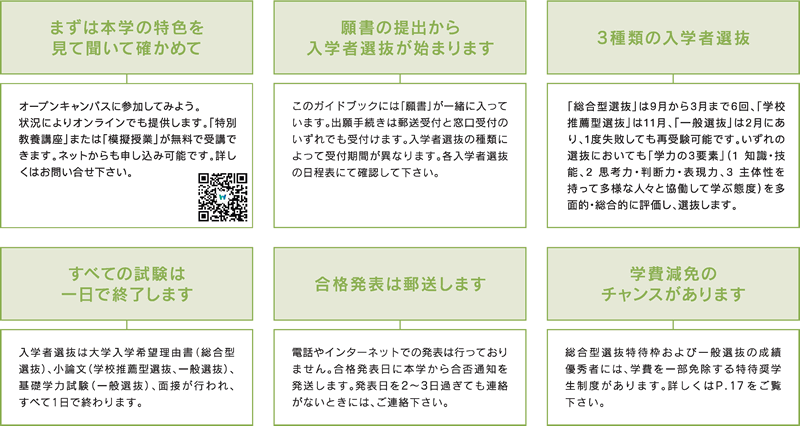 ※総合型選抜第1期・第5期は、対面とオンラインの両方で実施します。受験生は、どちらかの方法を選ぶことが出来ます。オンラインの場合、上記と時間が異なります。
