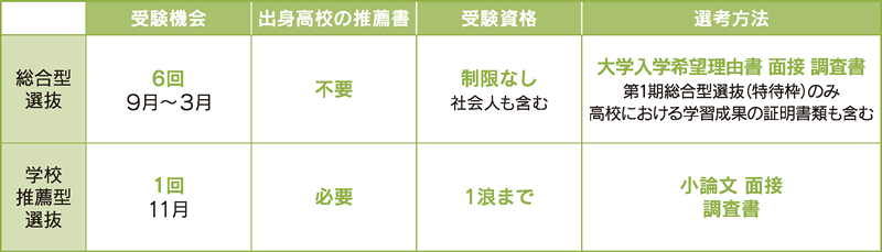 総合型選抜は推薦書が要らず、高校生に限らず大学生や社会人でも受験が可能ですので、早い段階で受験の意志が固まった人に向いています。期によっては、専願制か併願制か異なります。学校推薦型選抜との違いを以下の表でよく確認してください。