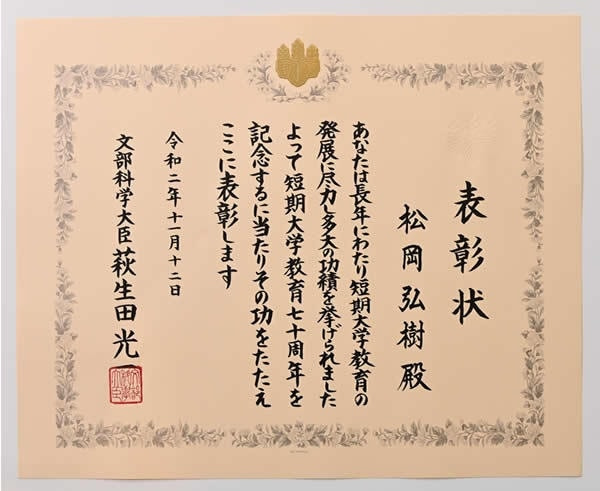 本学松岡弘樹学長が、文部科学大臣表彰の「短期大学教育功労者表彰」を受賞しました。今回の表彰は、本年が短期大学教育制度の創設から70周年を迎えることを記念して、短期大学教育に長く従事し、その功労が顕著な者及び短期大学教育に特に功績があった者を文部科学大臣が表彰し、その功に報いるとともに、短期大学教育の発展に資することを目的に行われました。