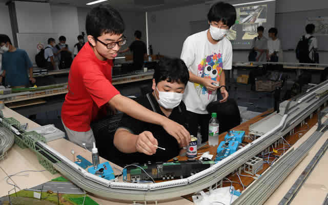 プラレールを使用したゲームや鉄道研究部によるダイヤ運転とジオラマ展示、鉄道員になった卒業生のフリートーク会などを行いました。